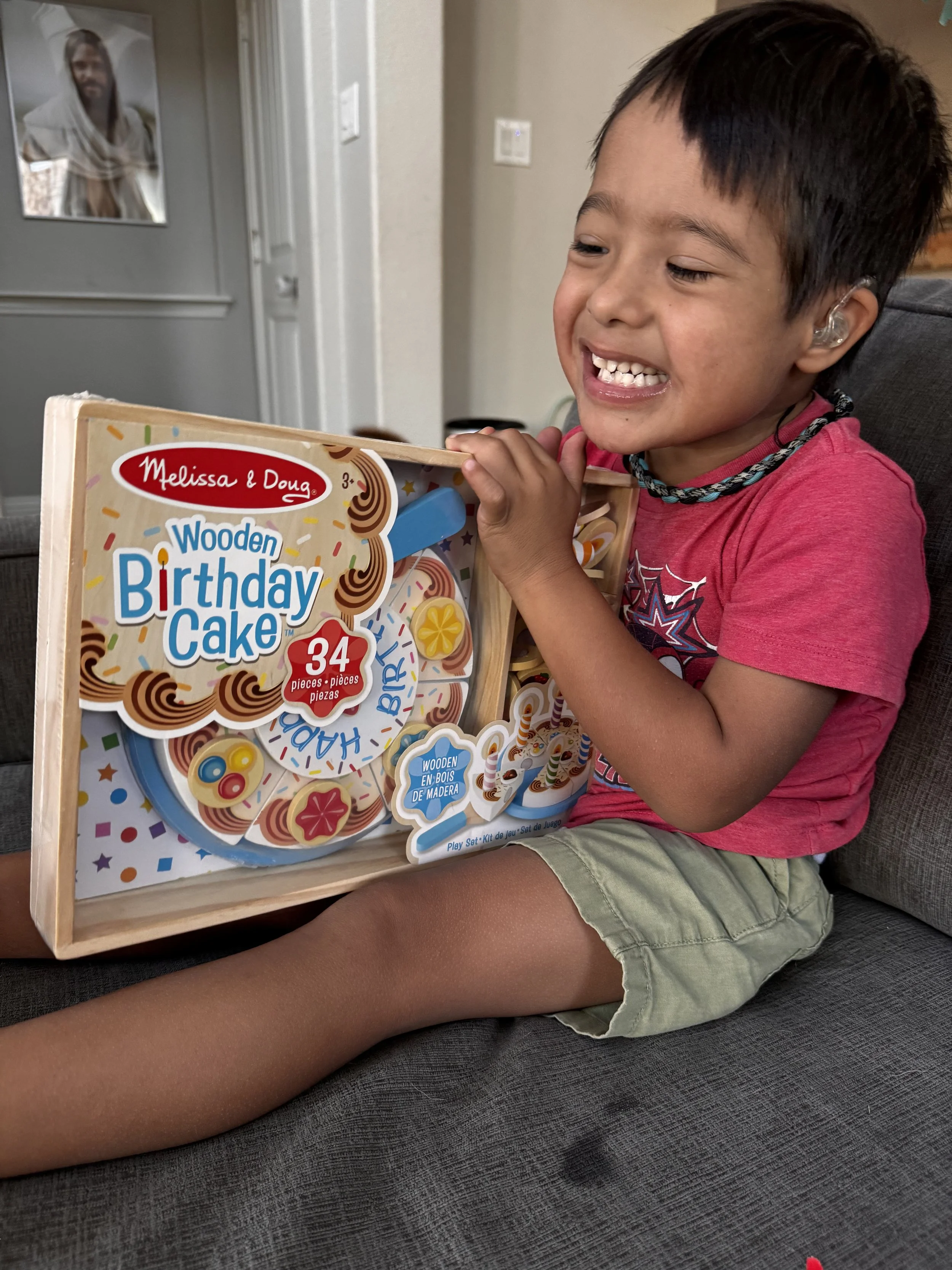 His language is coming along great, although he still needs a lot of help with articulation, which we're addressing in Speech therapy. He has moderately severe hearing loss in both ears, but he absolutely loves wearing his hearing aids (fortunately). We have been lucky with what a healthy kid he has been, but he has had chronic and rare issues related to his ears unfortunately. He will be going in for his 8th ear-related surgery on Tuesday, so any prayers would be appreciated. We're hoping this is the last one he'll need, and know he is in very capable hands.